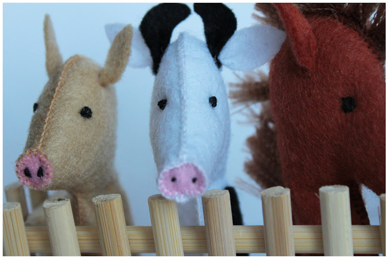 Сшила таких вот зверей пальчиковых для Алисы, начала с энтузиазмом, как обычно, а закончила еле еле..) Стооолько там мелких деталей, для меня оказалось сложновато такое шить...Использовала фетр, нитки обычные, синтепоном наполнила верх для того, чтобы форму держали, и для гривы лошадки репсовую ленту, которую потом распустила, чтобы гривой стала.